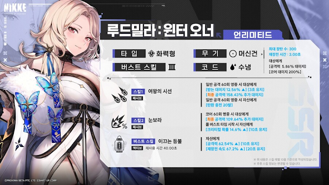 스킬들을 살펴보면, 공격력 증가 및 탄환 충전등 머신건을 쉬지 않고 때릴 수 있는 시원함을 보인것 같은 루드밀라: 원터 오너는 기존 3버스트 니케들중 0티어 급에는 들기는 힘들것으로 보이는 느낌이다. 예상은 길로틴을 넘지 못하지 않을가 싶었지만, 0티어 급으로 나왔다.