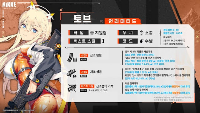 토브는 샷건 서포터 니케로 기존 샷건 파티에서 1버스트로 활약할 수 있을 것으로 보인다.