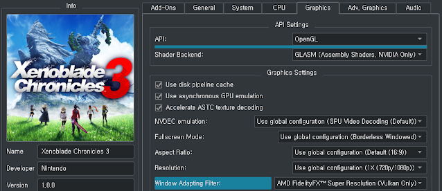 General 옵션에서 Extended memory layout을 6GB로 올리도록 하자. 제노블레이드 3의 경우이 옵션을 하지 않으면 게임이 실행 되지 않는다.