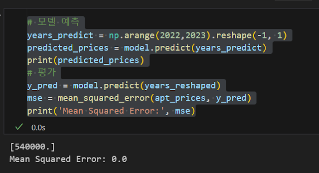 아래 코드는 가상의 아파트 가격을 통해 미래 아파트 가격을 예측하는 선형 회귀 모델이라고 할 수 있다.