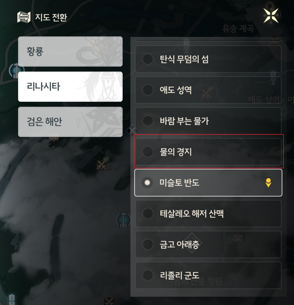 진행 기준은 플레이어가 위치한 지역을 기준으로 표시되기 때문에, 만약 필자가 물의 경지로 이동하면, 악몽 에코 출현을 위해서 해결해야 할 순례의 꿈을 표시해 준다.