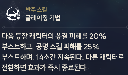 절지의 특성은 다음 캐릭터의 공명 스킬의 피해량과 응결 피해 를 증가시키는 부스트를 준다는 점에서 파티원들이 피해량을 보다 끌어 올려준다.