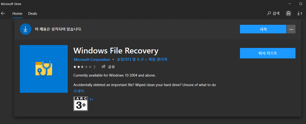 사용 방법은 Windows 10이상 Microsoft Store에서 'Windows File Recovery'로 검색하여 설치가 가능하다.
