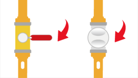밸브의 꼭지가 배관과 평행하게 되어 있으면 열림 상태이고, 배관과 수직이 되도록 돌리면 잠김 상태가 된다.