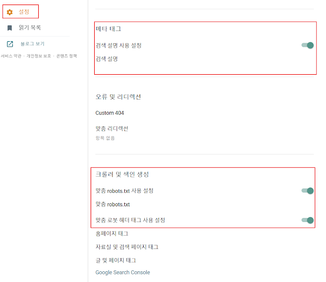 설정에 들어가면 검색에 최적화 할 수 있는 몇가지 옵션이 있는데 바로 메타 태그와 크롤러 설정이다. 기본적으로 비활성화 되어 있기 때문에 활성화 해놓는 것을 추천한다.