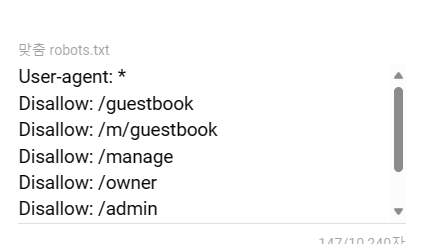 로봇파일을 이용하면 보다 명확하게 색인을 지시할 수 있기 때문에, 추가하는 것을 추천한다. 아래 내용은 티스토리의 robots.txt를 가져온 것으로 보통 search 부분에 대한 검색과 관리자 페이지는 제외하고 나머지에 대해서 색인하라는 의미이다.