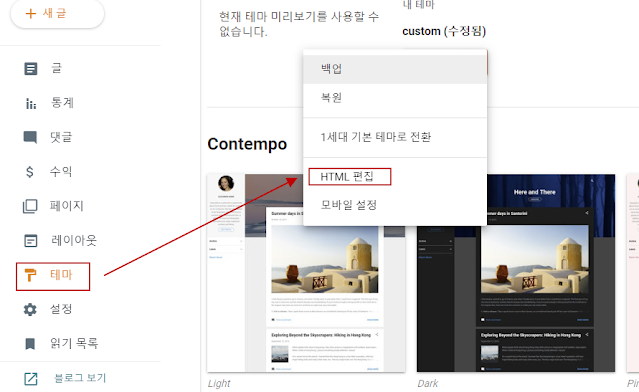 - '현재 테마' 탭에서 'HTML 편집'을 클릭합니다.
