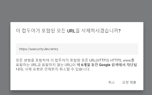 구글은 6개월간 임시 삭제를 지원하는데, 바로 유입을 차단하기 위해서 임시 삭제를 진행하자. 하위에 다수의 문서가 있는 경우 특정 접두어가 들어간 모든 URL 로 진행하면 쉽게 차단이 가능하다.