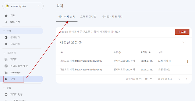 먼저 일시적인 URL 삭제와 캐시된 URL 삭제가 있다.