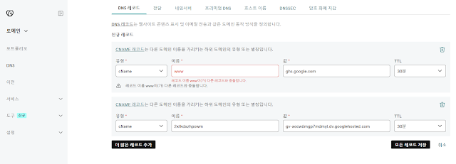 - CNAME을 생성하고자 하는 이름(필자는 www)으로 ghs.google.com을 만들어주고,