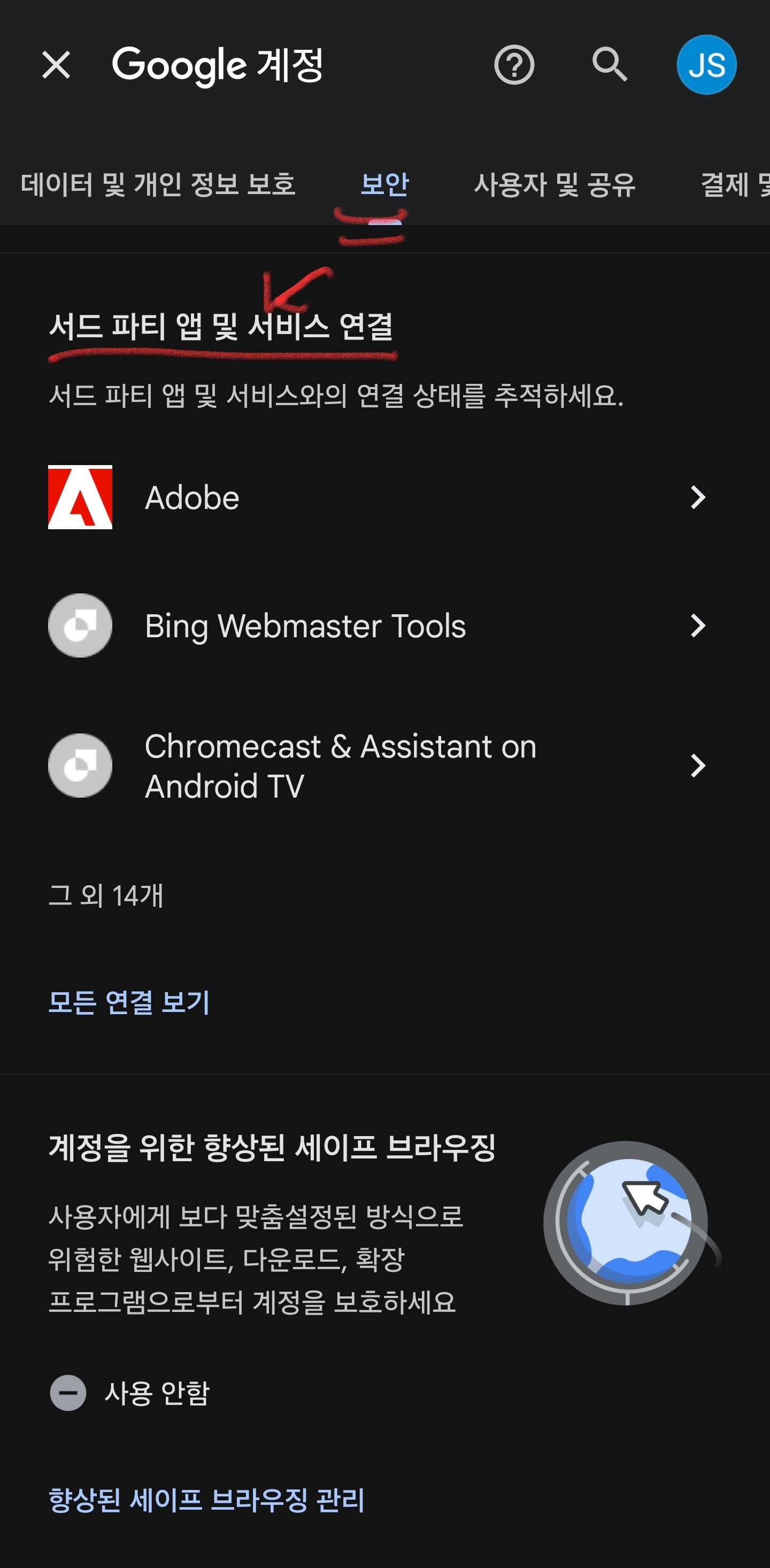 구글 계정의 관리로 들어가서 서드파티 앱 및 서비스 연결에서 관리가 가능하다.