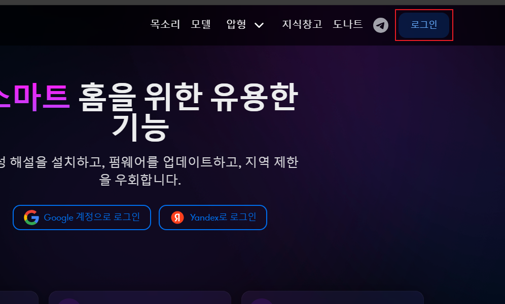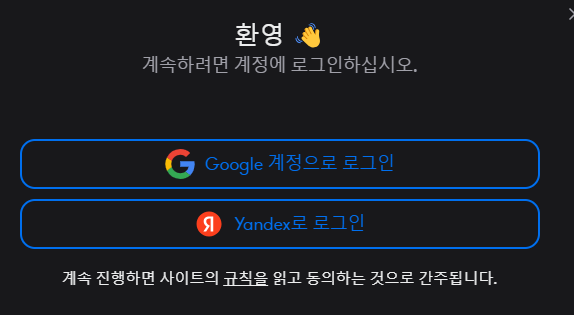 우측상단에 로그인 버튼을 통해서 로그인이 가능하다, 이때 구글이나 Yandex 계정을 이용하면 된다.