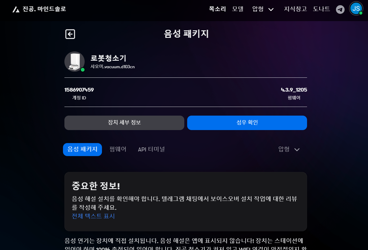 자신이 원하는 언어팩을 설치하고 성우 확인하기를 통해서 로봇청소기에 직접 들을 수 있다.