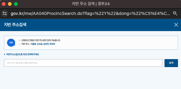 가장 중요한 부분이 출력을 위해서는 관할 처리 기관을 지정해야 하는데, 매매할 건물의 주소중 동 관련 정보를 입력하면 관련 처리 기관을 확인할 수 있다.