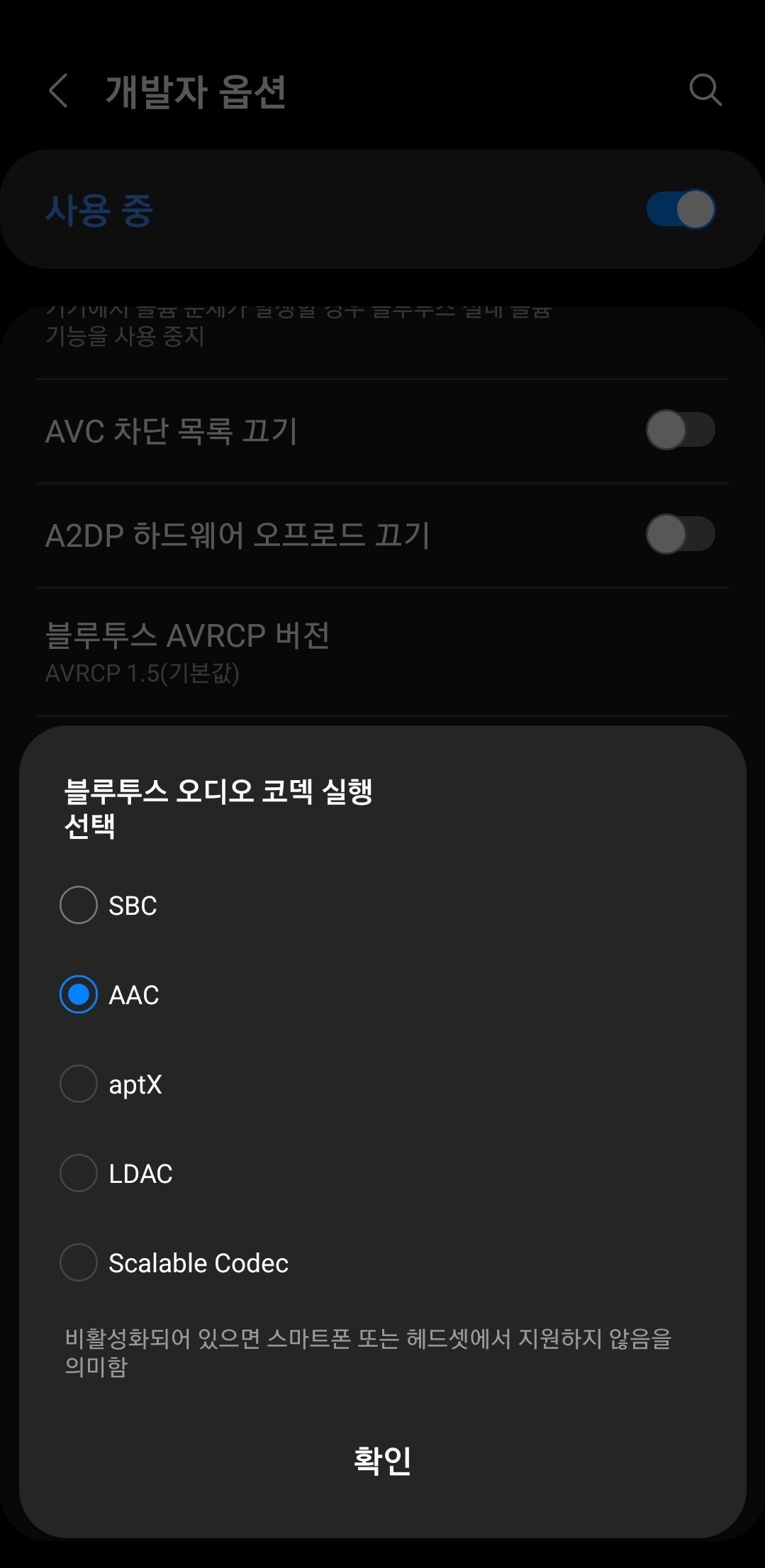 고음질 음원을 이용하지 않는다면 AAC가 음질이 더더 좋다는 의견도 있지만 코덱에 따라서 음질이 달라지고 블루투스 전송 구간의 손실 압축을 최소화하는 LDAC이 좋은 코덱은 맞다. 따라서 24Bit면 LDAC(집에서... 이동시는 끊길 수 있다), 16Bit라면 ACC가 좋을 것으로 판단된다. 그리고! 최종 선택은 본인 귀에서 원하는 것으로 선택하는 게 맞겠다.
