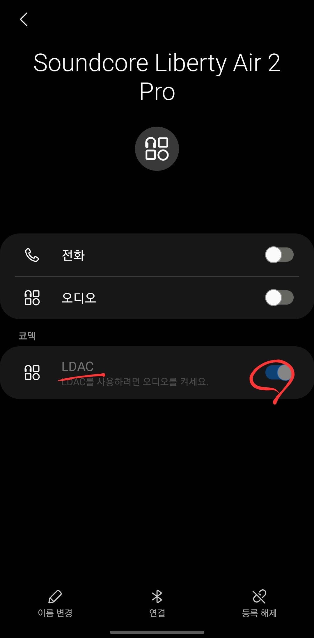 아래와 같이 블루투스 연결 장치에서 톱니바퀴 모양을 누르면 세부 설정을 할 수 있는데 LDAC 활성화를 통해 LDAC을 사용할 수 있다.