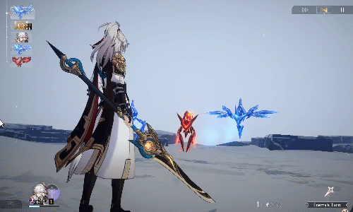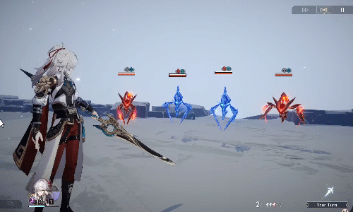 모든 적에게 경원 공격력 120/152/200%만큼의 번개 속성 피해를 가한다. 동시에 다음 턴 [신군]의 공격 단수가 3단 증가한다