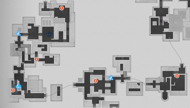 2. 종이새에 가기 위해 다리를 적절하게 배치해야 하기 때문에 가장 복잡하다고 할 수 있다. 3번 위치에서 2번으로 가기 위해 먼저 꿈의 눈을 이용해서 가장 왼쪽의 다리로 건너간다. 이후 꿈의 눈을 회수 하고, 이후 꿈 건축 모듈로 길을 연결하자. 다음은 현 지나갈 수 있는 아래쪽 길을 이용해서 다음 꿈 건축 모듈로 걸어가도록 하자(외길임). 이후 꿈 건축 모듈로 ㄱ자를 회전하면 앞서 우리가 조작한 연결 다리로 이동할 수 있게 된다. 그러면 네온싸인 간판이 길 옆에 있는데, 거기에 숨어 있다.