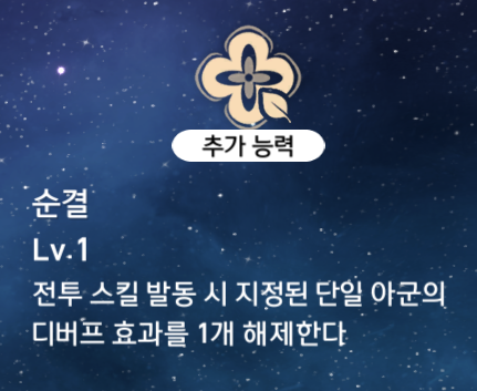 그리고 강적과 상대할 때 디버프 해제가 필요한 상황이 자주 발생하는데, 행적 돌파를 통해 디버프 해제까지 가능하여 보조 서포터 역활을 톡톡히 해낸다. 파티의 생존력을 최대한 끓어올릴 수 있다.