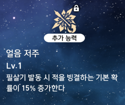 또 필살기는 적에게 50%확률로 빙결상태로 만들어 행동 게이지를 감소시킬 수 있어, 피해량과 함께 적의 행동을 지연시키는 유용한 기술이라고 할 수 있다.