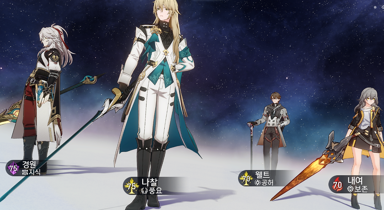 8명 중 부족한 캐릭터는 4성에서 보충을 하면 되는데, 4성인 경우에는 현재 파티에서 부족하다고 판단되는 운명의 길을 육성하거나, 성흔 돌파가 잘되어 있는 캐릭터를 육성하면 되겠다.(4성 역시 잘 키워주면 밥 값은 한다.)