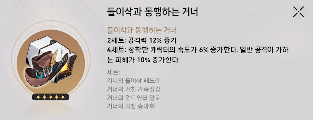 이 장비는 모든 딜러에게 유용한 공격력과 속도를 올려주기 때문에, 가장 무난하게 사용이 가능하며, 아래 표박의 길 침식된 터널을 공략하면, 풍요 장비와 함께 획득할 수 있어 파티 필수 캐릭터의 장비를 쉽게 획득할 수 있다.
