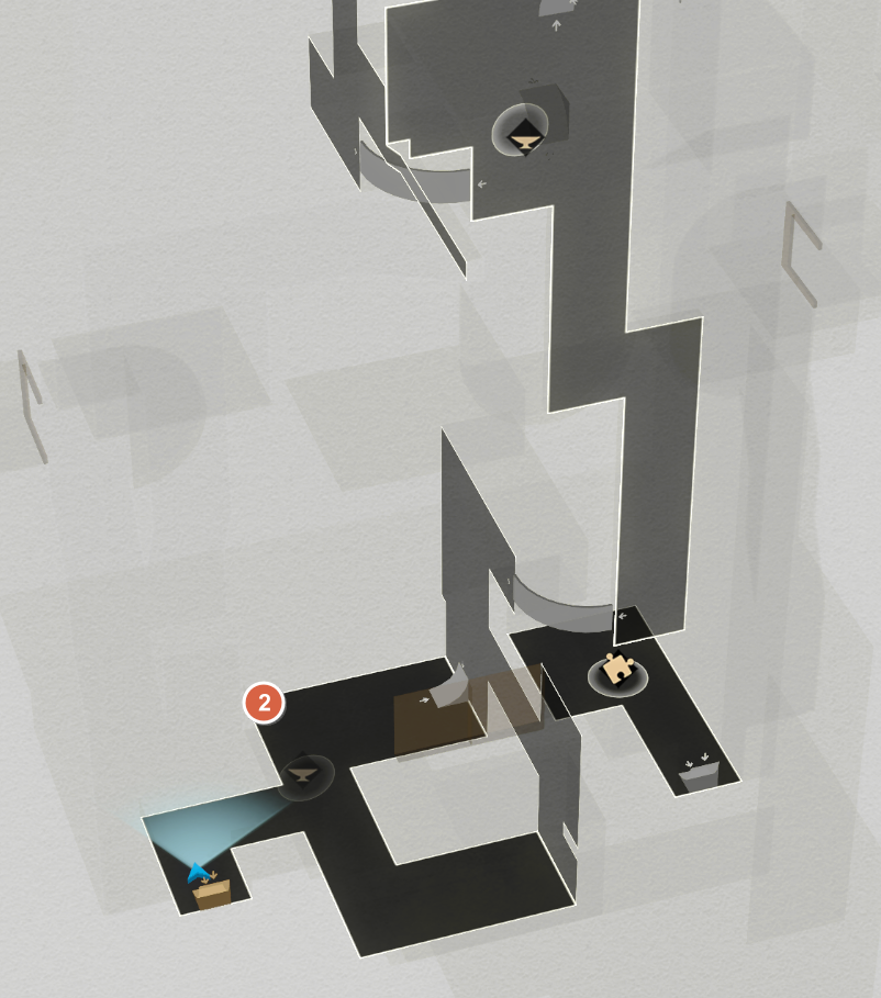- 중앙 큰방의 거품 다리를 사용하지 않고 홀 끝 쪽에 문이 하니 있다. 그 안쪽 방의 책장에 숨어 있다.