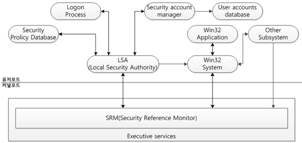 SRM을 통해 처리되는 보안 구성 요소들은 로그온, 보안 로그, 보안 정책, 유저 계정 등이 있으며, 아래와 같이 SRM과 연결되어 권한에 대해 이상이 없는지 확인한다.
