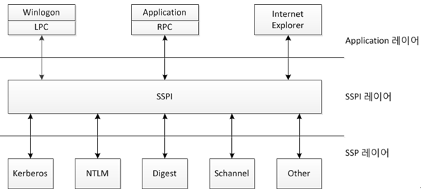 사용자 로그인 처리는 Winlogon이 사용자 상호 작용 역활을 담당하며, Winlogon에서 로드한 자격 증명 제공자로부터 LsaLogonUser API를 통해 사용자 이름과 패스워드(기타 다른 인증 토큰) 등 로그온 정보를 LSA가 전달 받게 된다. 그리고 해당 내용을 네트워크 계층과 응용 계층 사이에 위치한 SSPI(Security Support Provider Interface)로 전달된다. 이는 Lsass에서 제공하는 함수인 LsaLookup-AuthenticationPackage를 이용해 서로 다른 프로토콜간 통일화한 것으로, 이를 통해 적절한 인증 패키지를 선택하게 된다.