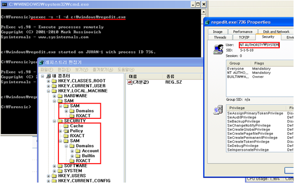 아래 Psexec 도구을 이용해 Psexec –s –I –d c:\windows\regedit.exe 명령을 실행하면 로컬 시스템 계정으로 Regedit을 실행하여 기본적으로 보이지 않는 레지스트리 정보인 SAM과 SECURITY 정보를 엿볼수 있다.