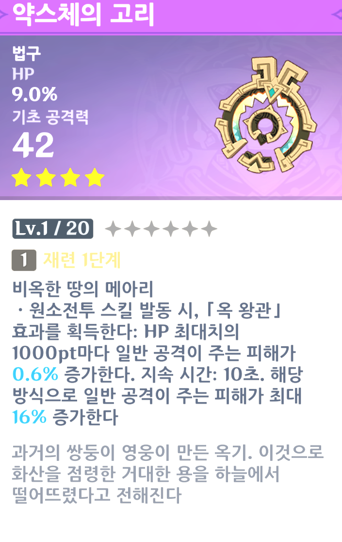 5강화 원소전투 스킬 발동 시, 「옥 왕관」 효과를 획득한다: HP 최대치의 1000pt마다 일반 공격이 주는 피해가 1% 증가한다. 지속 시간: 10초. 해당 방식으로 일반 공격이 주는 피해가 최대 32% 증가한다