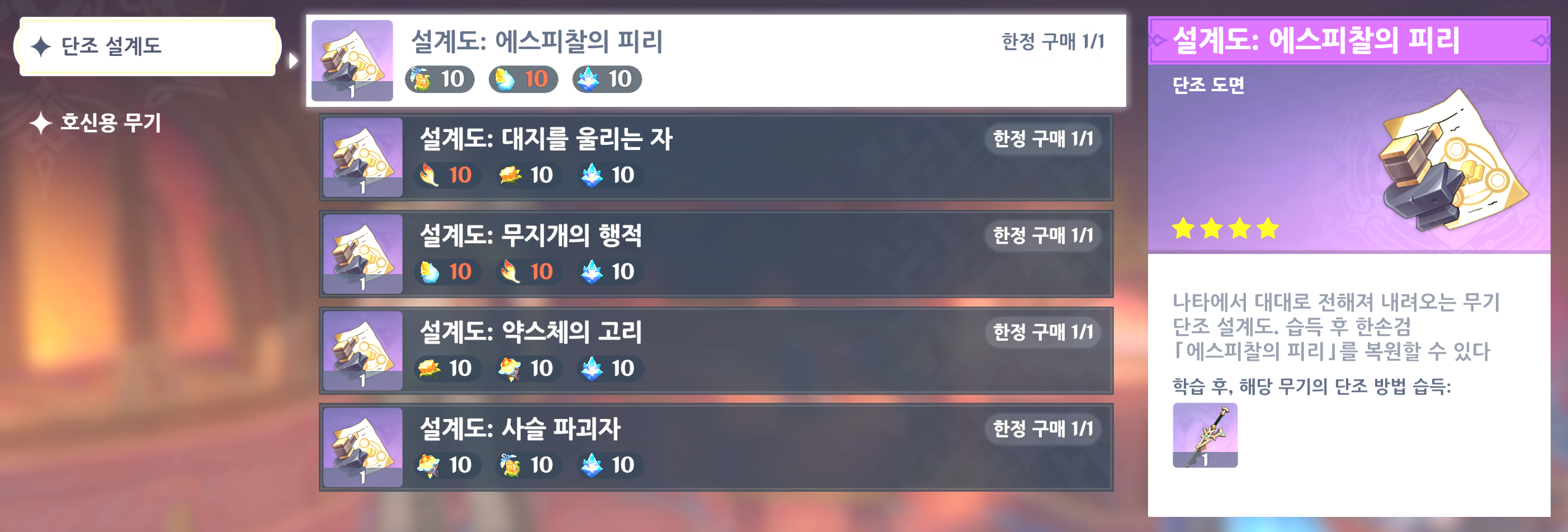 특히 나타 캐릭터 뿐만 아니라 범용성도 나쁘지 않게 설계되어 있어서 단조해 놓을 경우 상당히 유용하기 때문에 설계도를 미리 알아두면 유용하다.