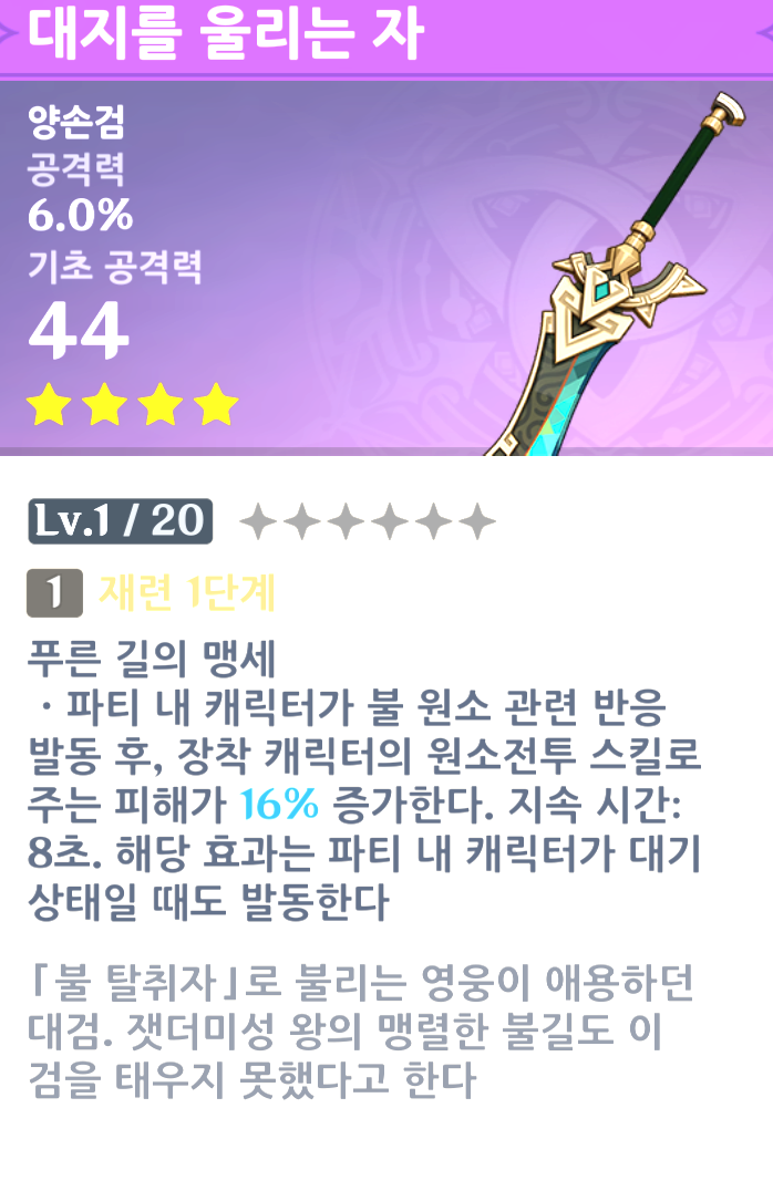5강화 파티 내 캐릭터가 불 원소 관련 반응 발동 후, 장착 캐릭터의 원소전투 스킬로 주는 피해가 32% 증가한다. 지속 시간: 8초. 해당 효과는 파티 내 캐릭터가 대기 상태일 때도 발동한다