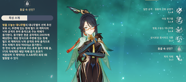 레벨 돌파 특성에 피해량 증가와 힐까지, 너무 좋다. 레벨 돌파 재료는 능운린갑(46), 금주의 두루마리(36), 청수옥(168)이다.
