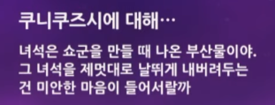 자색의 정원 이벤트에서 "그녀에게 전하거라, 나의 이름은『쿠니쿠즈시』라고" 하며 카에데하라 요시노리를 살려주는데 실제 라이덴 쇼군 음성 파일을 확인해 보면 쿠니쿠즈시에 대하여로 되어 있다.