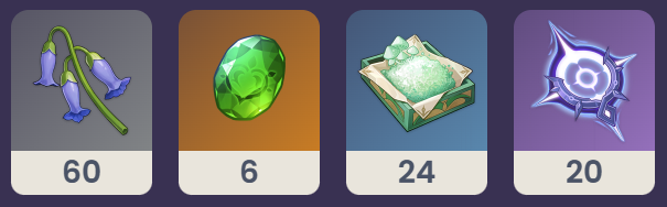 기초 공격력: 510 HP: 41.2% 원소폭발 발동 후 6초 동안 2초마다 원소 에너지를 4/4.5/5/5.5/6pt 회복한다. 파티 내 모든 캐릭터의 HP를 2초마다 4/4.5/5/5.5/6% 회복한다 |