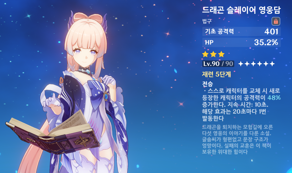 현금을 투자하여 1돌까지 만든 첫 과금을 시작하게 해 준 캐릭터라고 할 수 있다.(현재 한정 픽업 캐릭터 중 유일한 1돌 캐릭터이다)