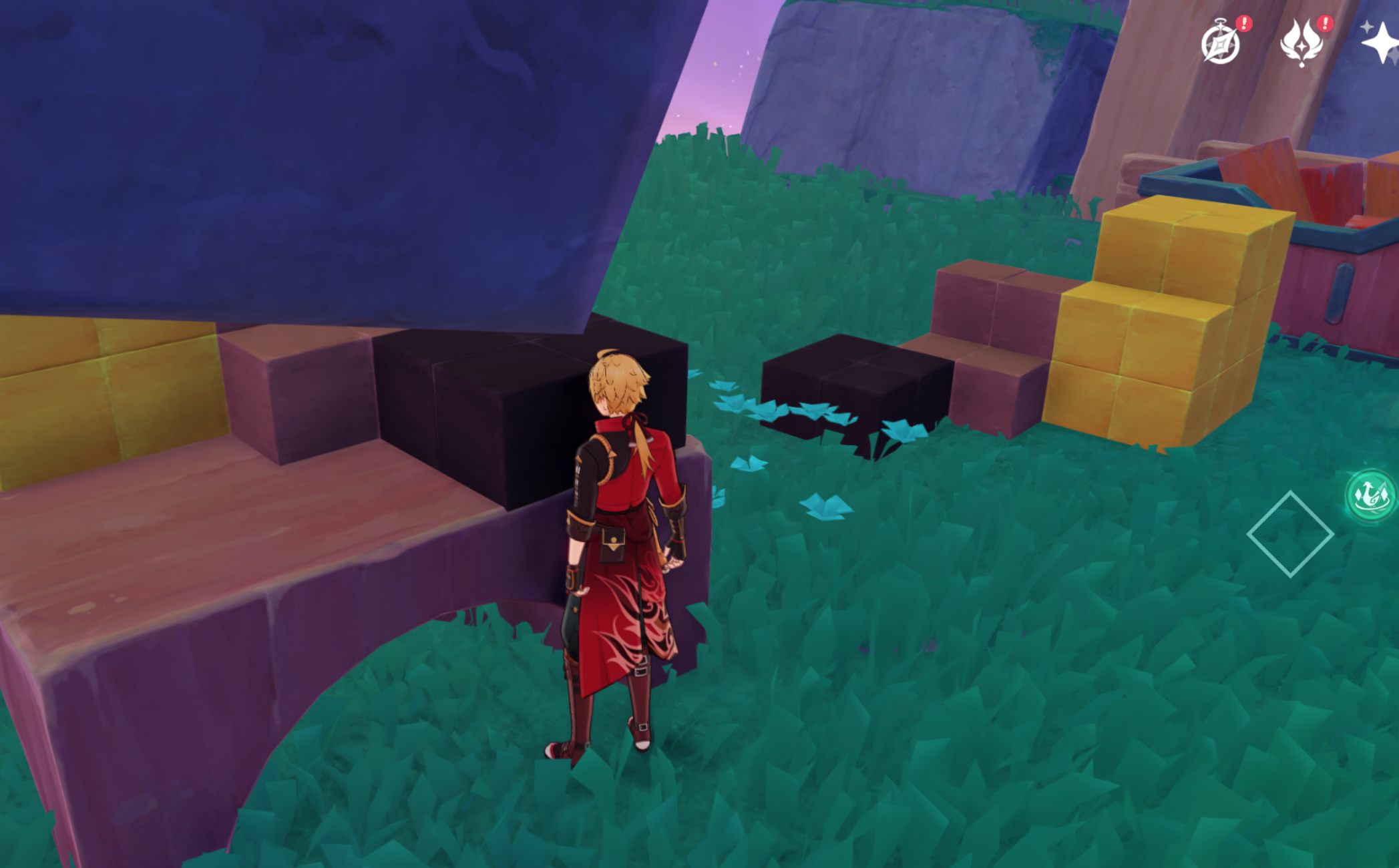붉은 블럭을 앞에 설치한후 불 원소 캐릭터로 불 원소 반응을 일으키면, 블럭이 까만게 변하게 되고 이를 설치하면 된다.
