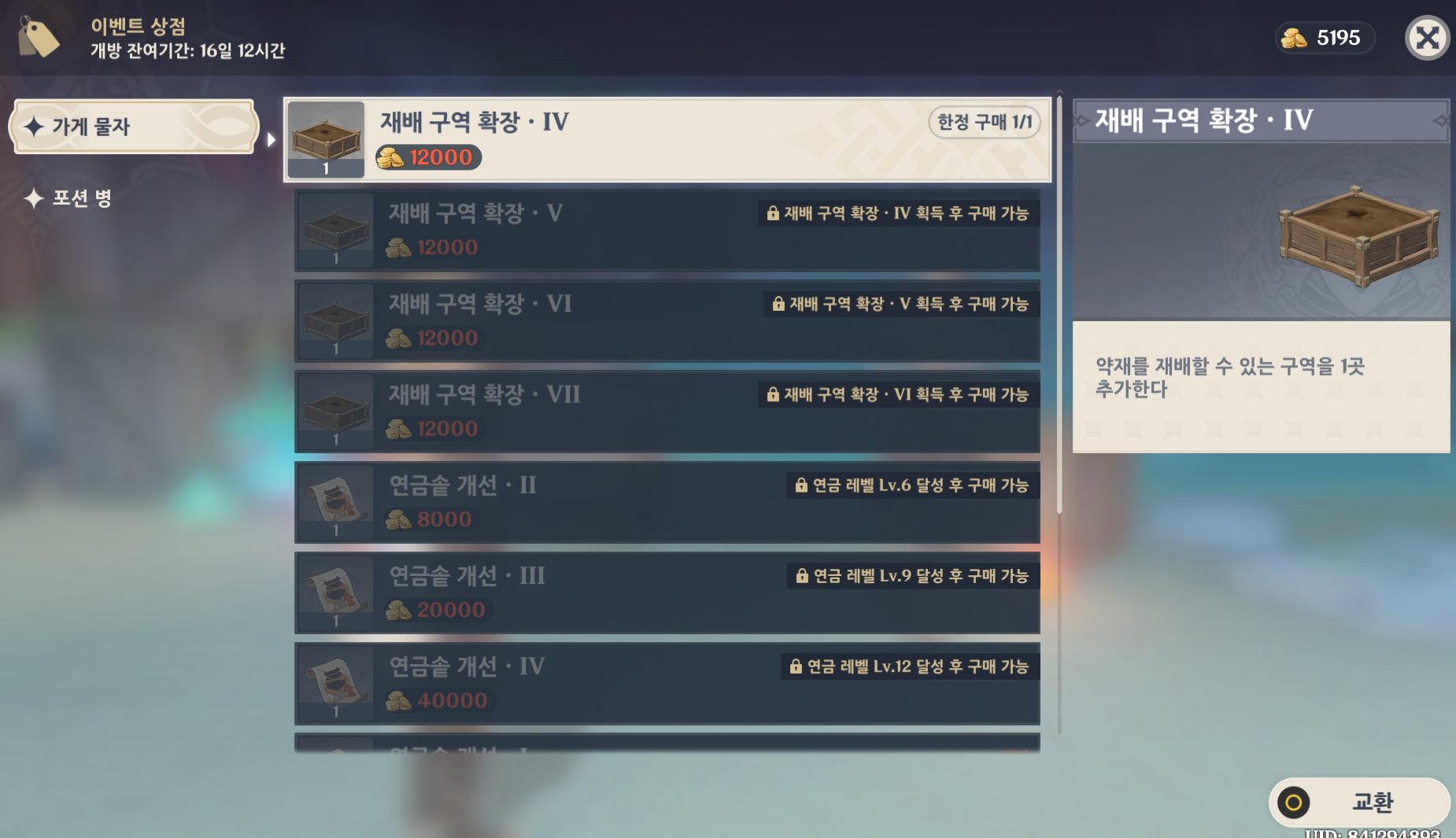 연금술을 위해서는 약재가 필요하다. 이를 위해서는 약재를 키워야 하는데, 재배 구역 확장은 많이 구매해야 한다.