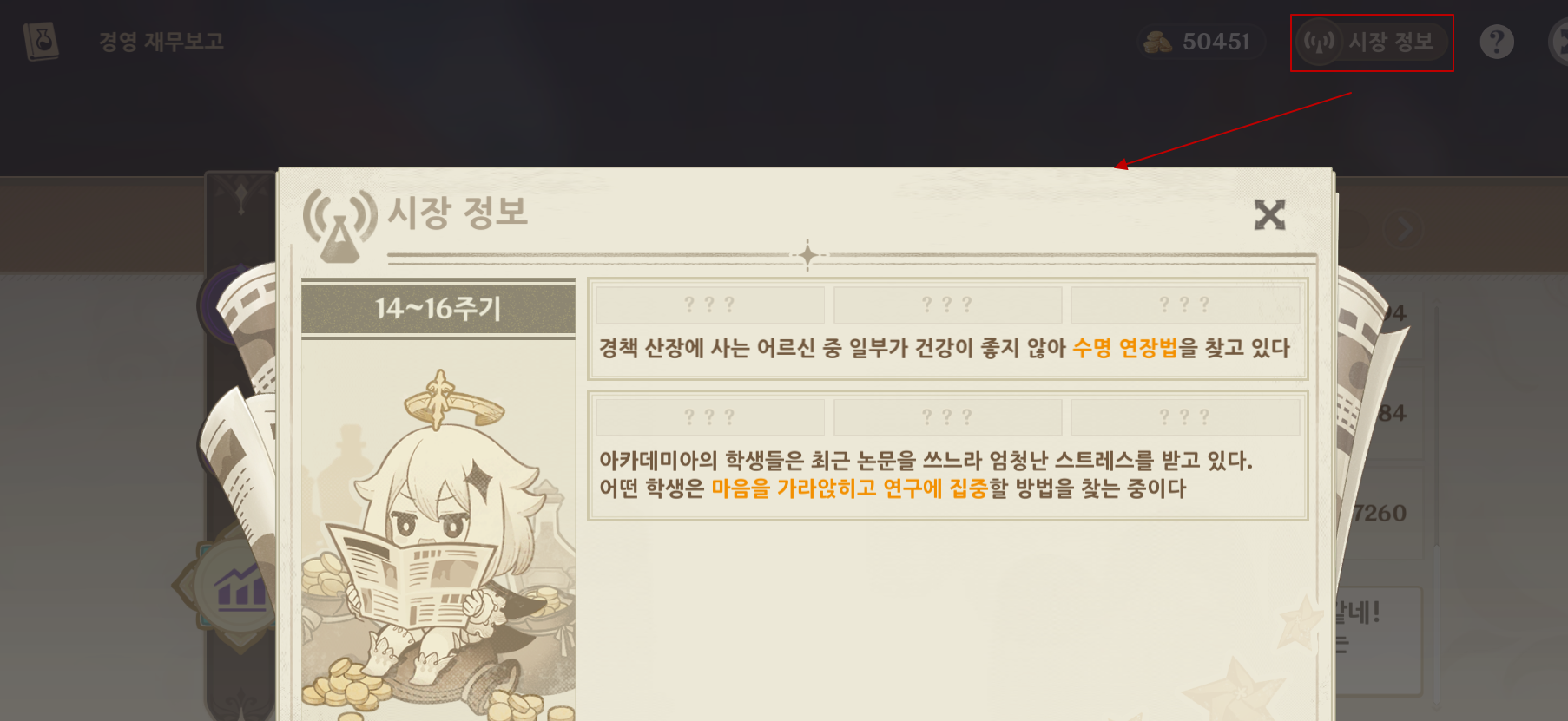 주기 마다 연금술 1회, 포션 개선 1회, 약재 재배는 2주기 마다 획득할 수 있다. 만약 재배, 연금, 판매에서 빠진게 있다면 경고 메시지가 표시되므로 안심하고 진행하자.