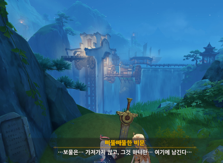 이후 임무에 따라서 밖으로 나오면, 옛 검의 명문 1을 발견할 수 있고, 옆 비석에서 보물은... 유롱항의 경치 라면서... 임무가 마무리 된다.