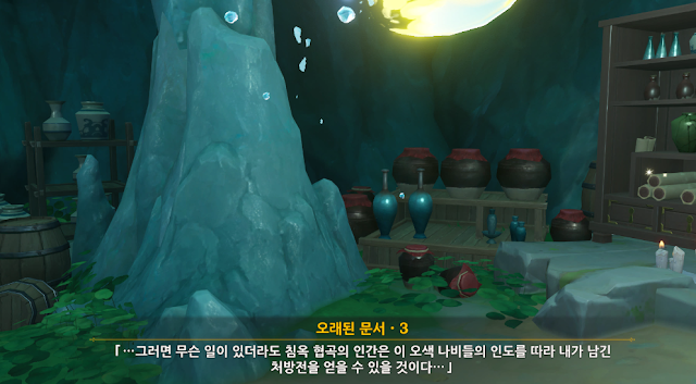 순간이동을 진행하면, 마른 나무가지가 자라나면서, 약군의 작업실이 열리고, 화려한 보물 상자를 획득할 수 있다. 안에는 부금, 그리고 영연에 대한 짧은 이야기들과, 약군이 마지막을 암시하는 내용을 확인할 수 있다.