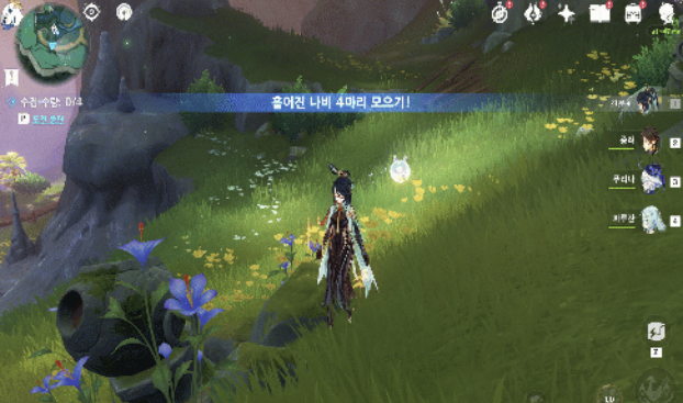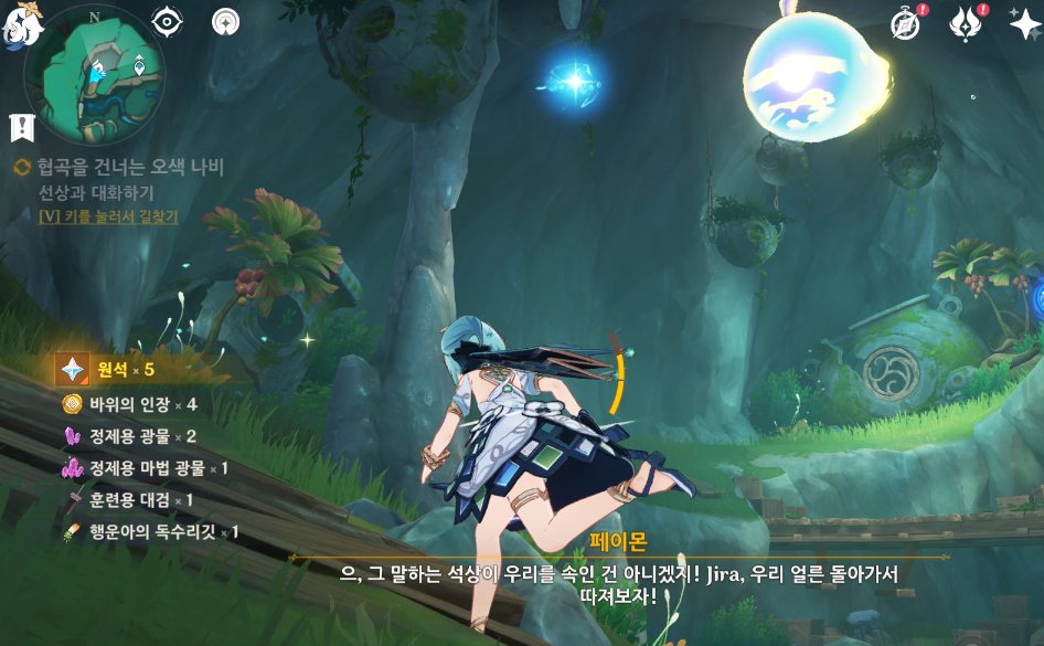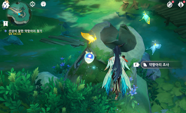 바위입자를 수집하는 임무이다 따라가면서 수집하다보면,나비가 있는 곳으로 안내한다.