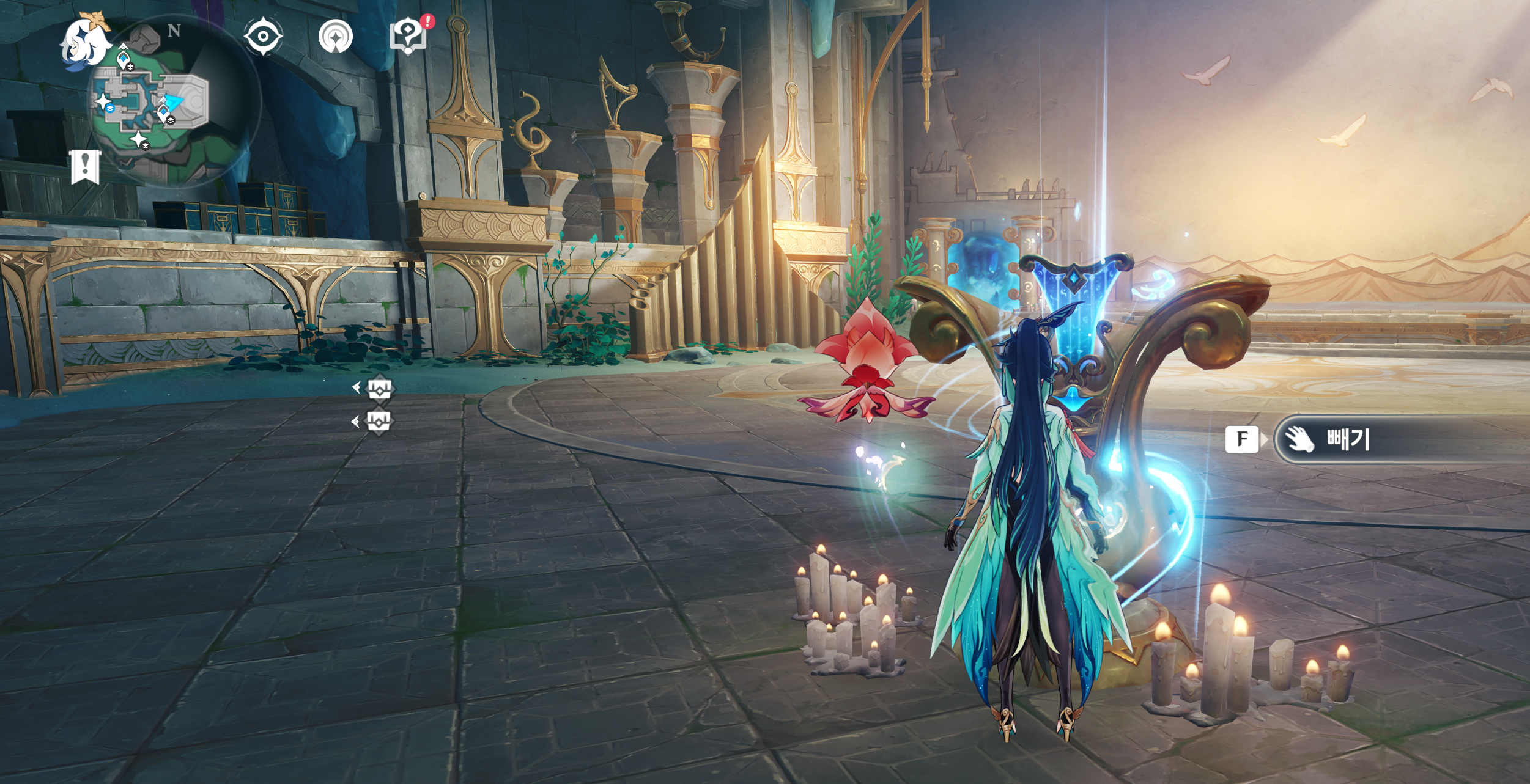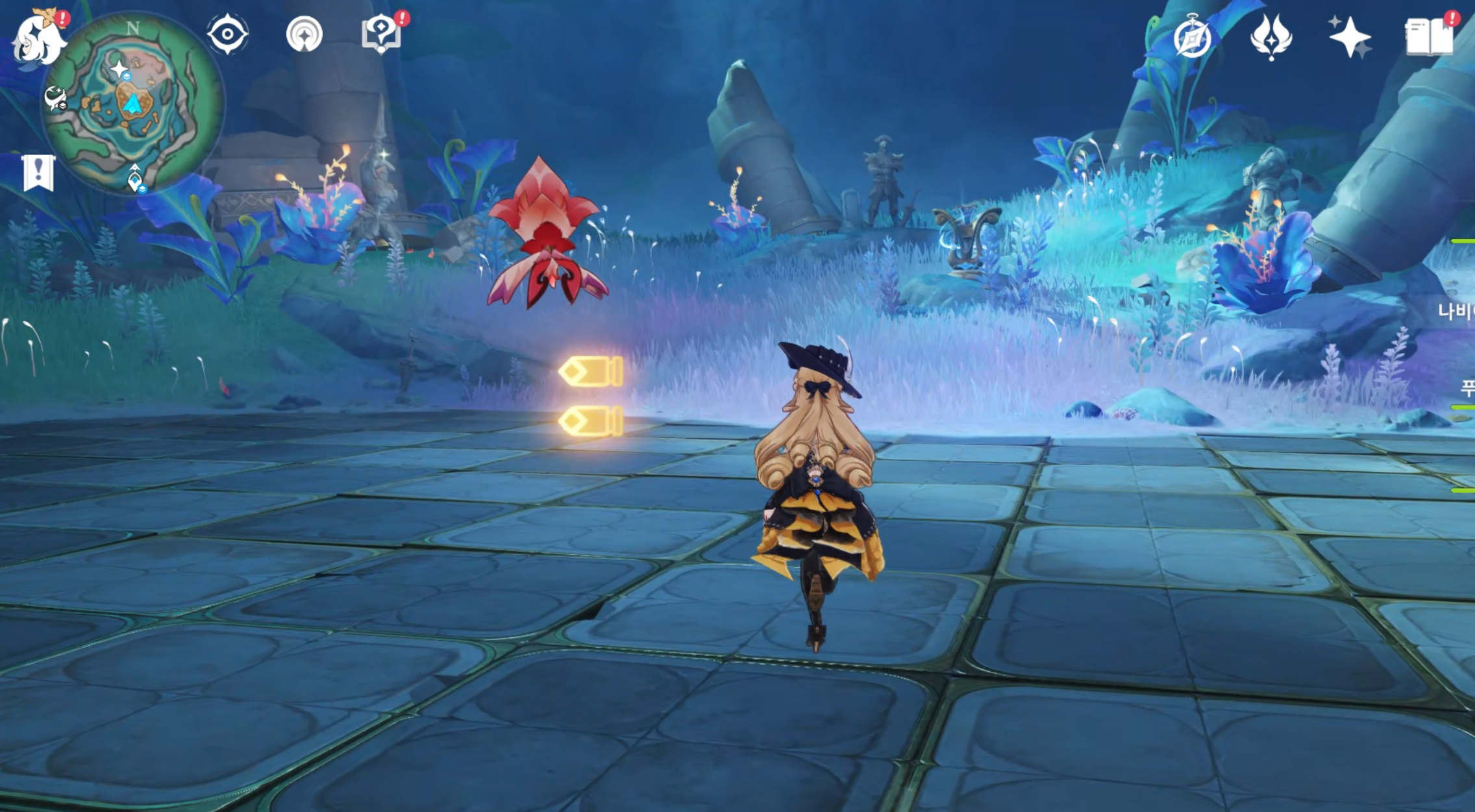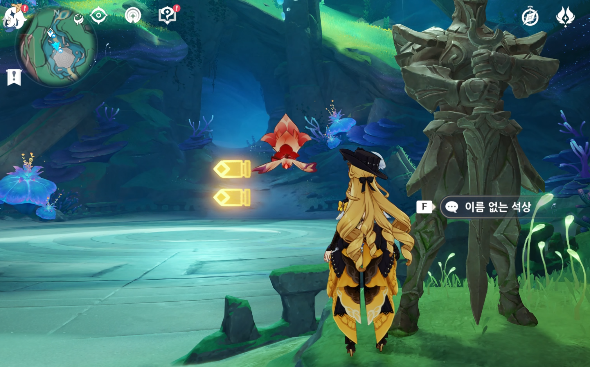 악보를 찾기 위해서는 앞에 막고 있는 보호막을 제거 해야 한다. 이를 위해 간단한 전투 기믹을 진행해야 하는데, 용도마뱀이 상당수 나타난다. 이름 없는 석상에게 얘기를 하면 임무를 진행할 수 있다.
