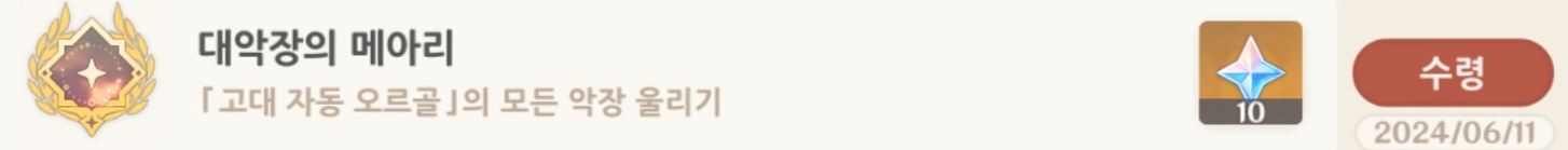 이렇게 모든 악장을 획득하면, 대악장의 메아리라는 업적이 달성되면서 지난날의 바다의 악장 모으기가 완료된다.