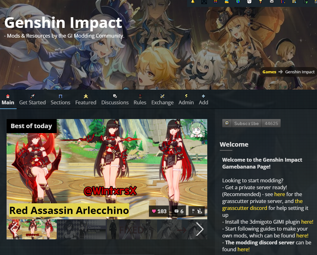 스킨 커뮤니티로 가장 유명한 곳은 GameBanana 로 원신은 8552 이다.