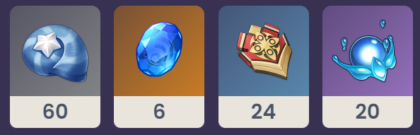 레벨 돌파 재료는 리월의 초보자 킬러 물의 정령이다. 별소라는 야란과 동일하게, 리월 해안가를 배회하면 얻을 수 있다.
