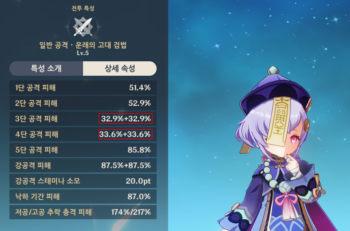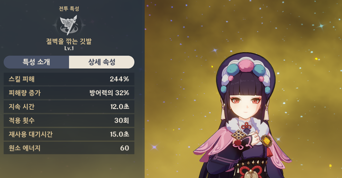 원소 폭발을 사용하면 16초간 8% 공격력 증가를 기본적으로 받고, 자신의 체력이 줄어들때 10%의 공격력증가를 최대 4회(중첩) 받게된다. 즉 최대 48%의 공격력 증가 효과를 누릴 수 있다.