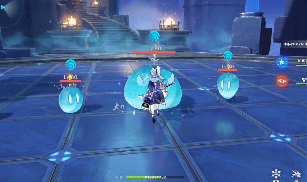 원소 전투 스킬은 아야카 주변 일정 지면으로 얼음 꽃을 소환하여, 폭발하면서 주변적을 띄우게 된다.