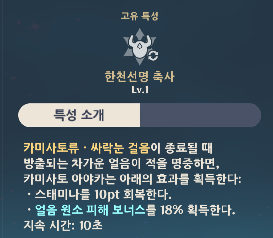 이를 통해 얼음원소 공격을 할 수 있는데, 레벨 돌파 특성으로 얼음 원소 피해 보너스 18%도 획득할 수 있어 데미지를 더욱 높일 수 있다.